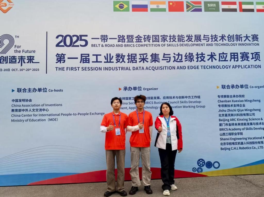 10月20日,2025一带一路暨金砖国家技能发展与技术创新大赛“第一届工业数据采集与边缘技术应用赛项”中国区决赛在山西工程职业学院圆满收官。控制工程学院万波、张建鑫两名同学组队参赛,与全国近80所院校的100支代表队、200名选手同台竞技,沉着冷静、出色发挥,获得学生组一等奖,展示了电气自动化专业学子风采!